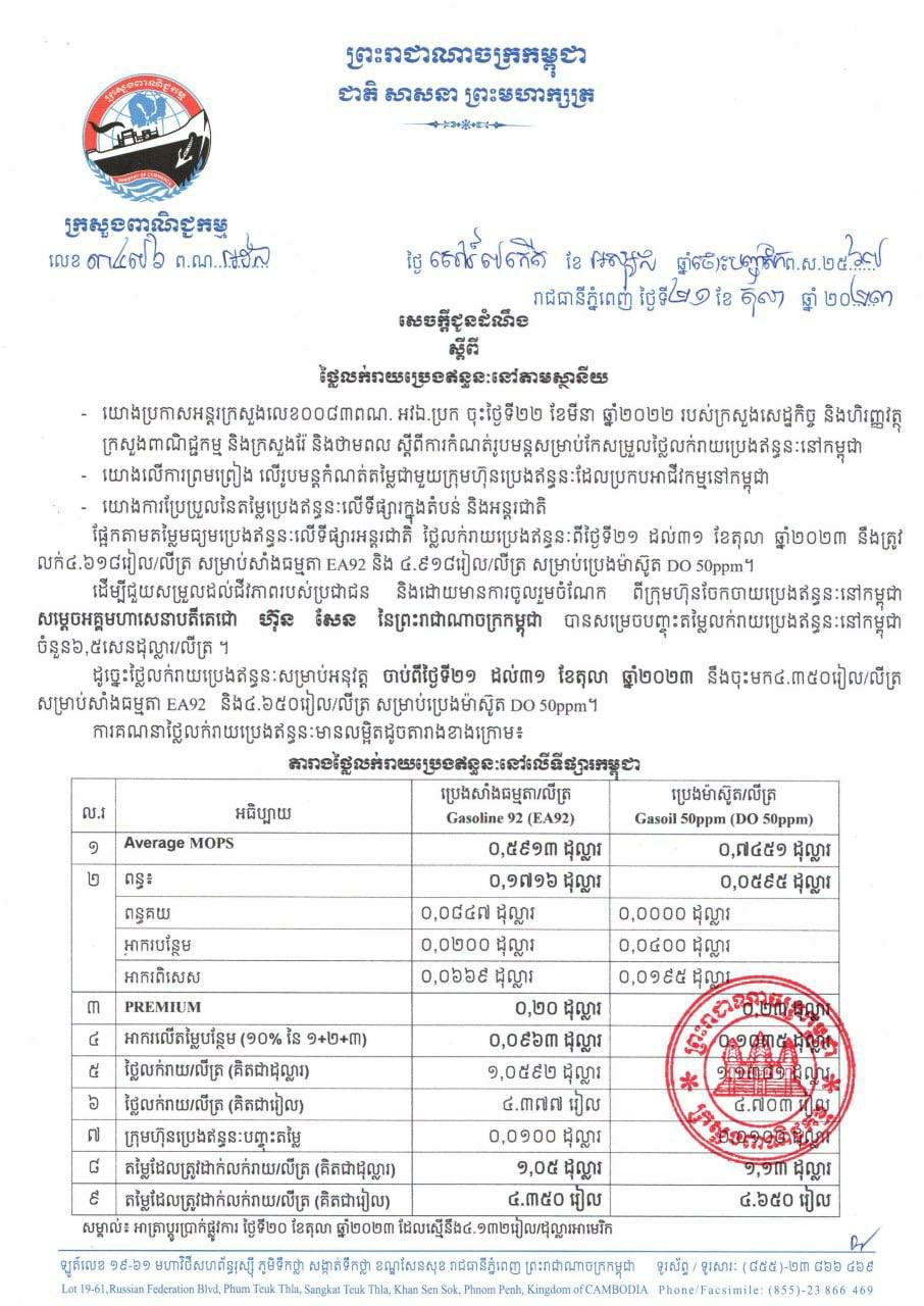 ព័ត៌មានជាតិ ក្រសួងពាណិជ្ជកម្ម ជូនដំណឹងស្ដីពីតម្លៃលក់រាយប្រេងឥន្ធនៈថ្មី ដែលត្រូវអនុវត្តចាប់ពីថ្ងៃទី២១ ដល់ Posted on October 21, 2023 Author sornrun Comment(0) ក្រសួងពាណិជ្ជកម្ម ជូនដំណឹងស្ដីពីតម្លៃលក់រាយប្រេងឥន្ធនៈថ្មី ដែលត្រូវអនុវត្តចាប់ពីថ្ងៃទី២១ ដល់ថ្ងៃទី៣១ ខែតុលា ឆ្នាំ២០២៣៖ – ប្រេងសាំងធម្មតា ៤ ៣៥០រៀល/លីត្រ – ប្រេងម៉ាស៊ូត ៤ ៦៥០រៀល/លីត្រ
