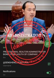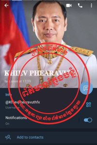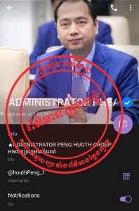 ក្នុងការបង្កេីតជាគណនីតេឡេក្រាម និងបណ្តាញទំនាក់ទំនងសង្គមផ្សេងៗក្នុងចេតនាទុច្ចរិត ដេីម្បីប្រព្រឹត្តសកម្មភាពផ្ទុយនឹងច្បាប់ ដែលទង្វើបែបនេះនាំអោយប៉ះពាល់ដល់ កិត្តិយស កិត្យានុភាពរបស់ក្រសួង ស្ថាប័នរដ្ឋ និងឯកជនភាព កិត្តិយស សេចក្តីថ្លៃថ្នូររបស់ឯកឧត្តមផ្ទាល់ ។