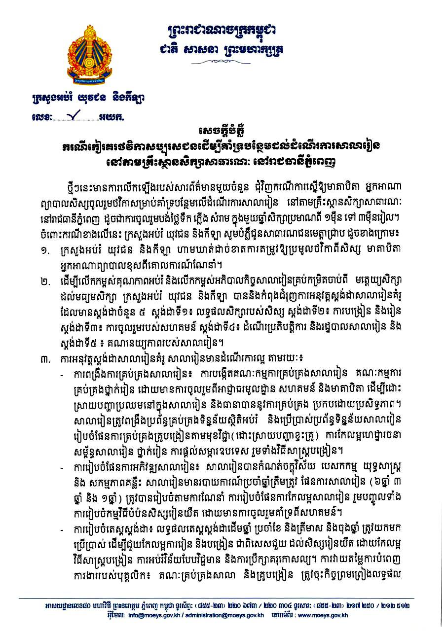ព័ត៌មានជាតិ ក្រសួងអប់រំ ហាមឃាត់ដាច់ខាតការតម្រូវ ឱ្យប្រមូលថវិកាពីសិស្ស មាតាបិតាអ្នកអាណាព្យាបាលសិស្ស Posted on February 5, 2024 Author sornrun Comment(0) ក្រសួងអប់រំ ហាមឃាត់ដាច់ខាតការតម្រូវ ឱ្យប្រមូលថវិកាពីសិស្ស មាតាបិតាអ្នកអាណាព្យាបាលសិស្ស