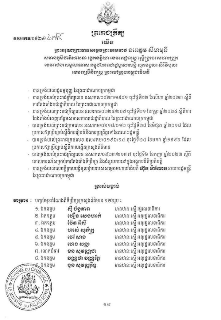 បញ្ចប់មុខតំណែងទីប្រឹក្សាក្រសួងព័ត៌មាន «មួយកញ្ចប់ធំ» រហូតដល់១២៦រូប❗🇰🇭 👉 ឯកឧត្តម-លោកជំទាវ ចំនួន១២៦រូប ត្រូវបានត្រាស់បង្គាប់បញ្ចប់មុខតំណែងពី ទីប្រឹក្សាក្រសួងព័ត៌មាន ដោយព្រះរាជក្រឹត្យលេខ នស/រកត/០៥២៤/៤៧៩ ចុះថ្ងៃទី២៣ ខែឧសភា ឆ្នាំ២០២៤ ។